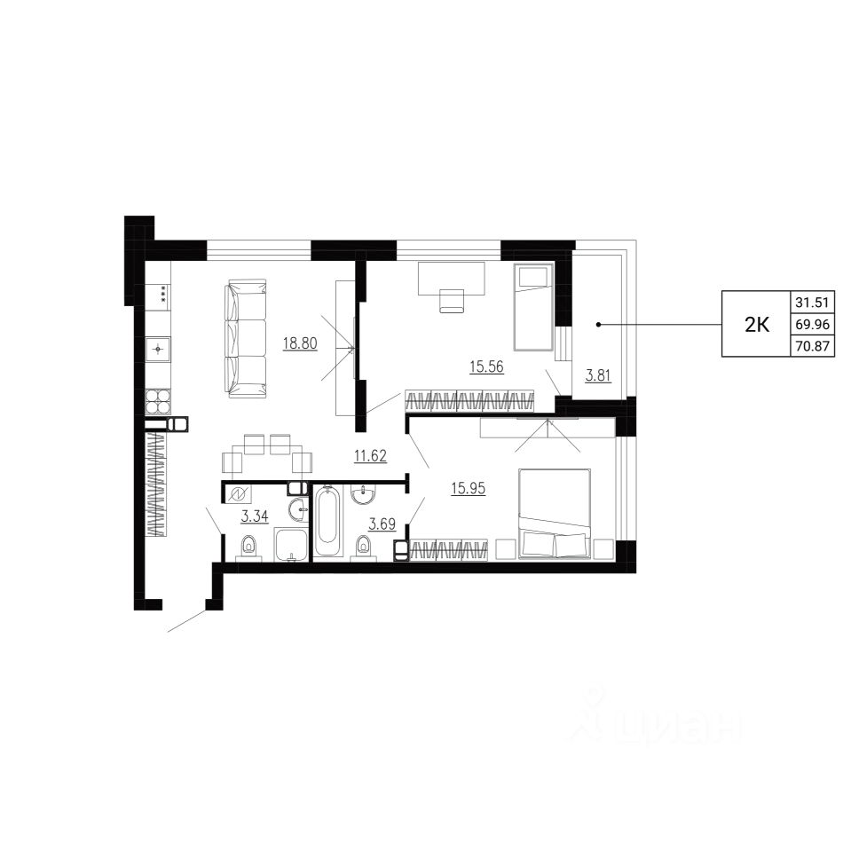 Общая площадь70,87 м2