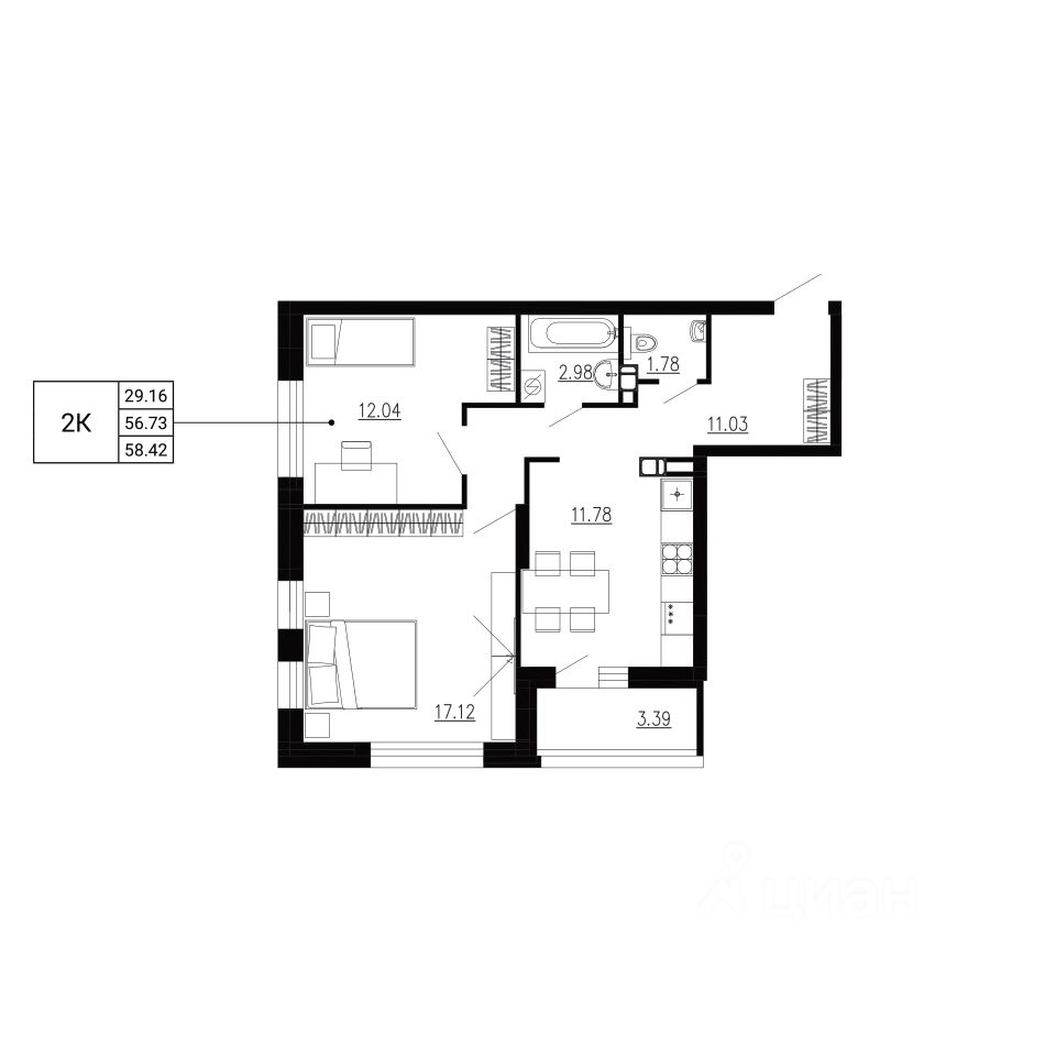 Общая площадь58,42 м2