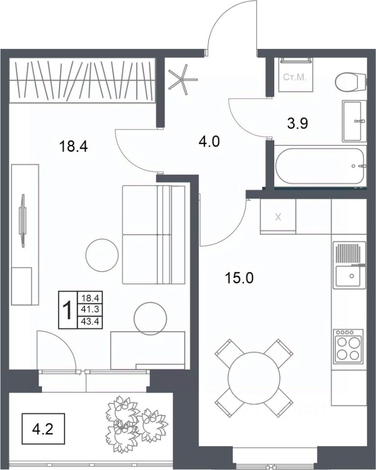 Общая площадь43,4 м2
