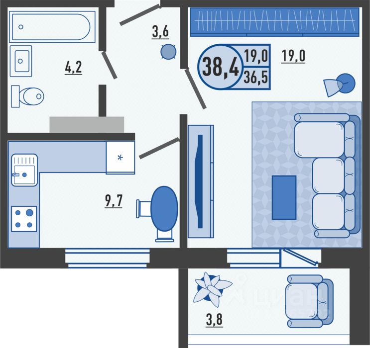 Общая площадь38,5 м2