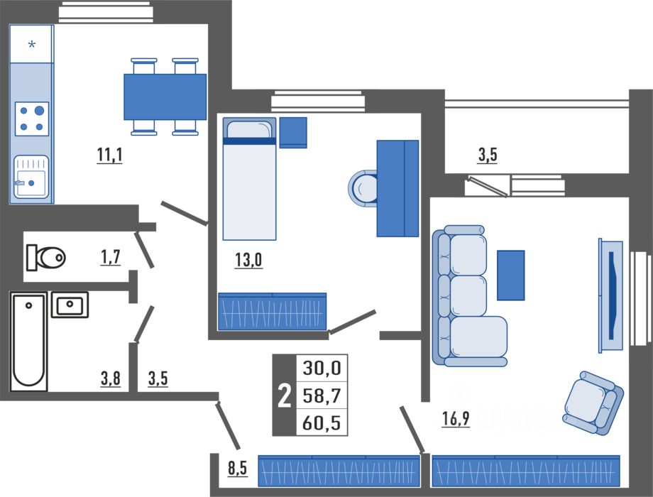 Продаётся 2-комнатная квартира в строящемся доме (Корпус 1), срок сдачи: II-кв. 2028, общей площадью 60.5 кв.м., на 17 этаже. Новый жилой комплекс ''Поколения'' от застройщика ''ОДСК'' расположен по адресу Орловская область, Город Орёл, Улица Льва Толстого.
