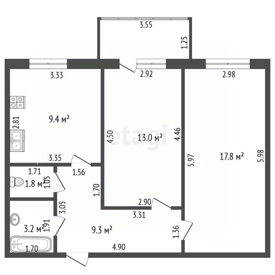 Общая площадь 55 кв м, кухня 9 кв м, комнаты 12 и 18 кв м. В квартире косметический ремонт, раздельный санузел, большой балкон застеклен, Дверь входная железная.