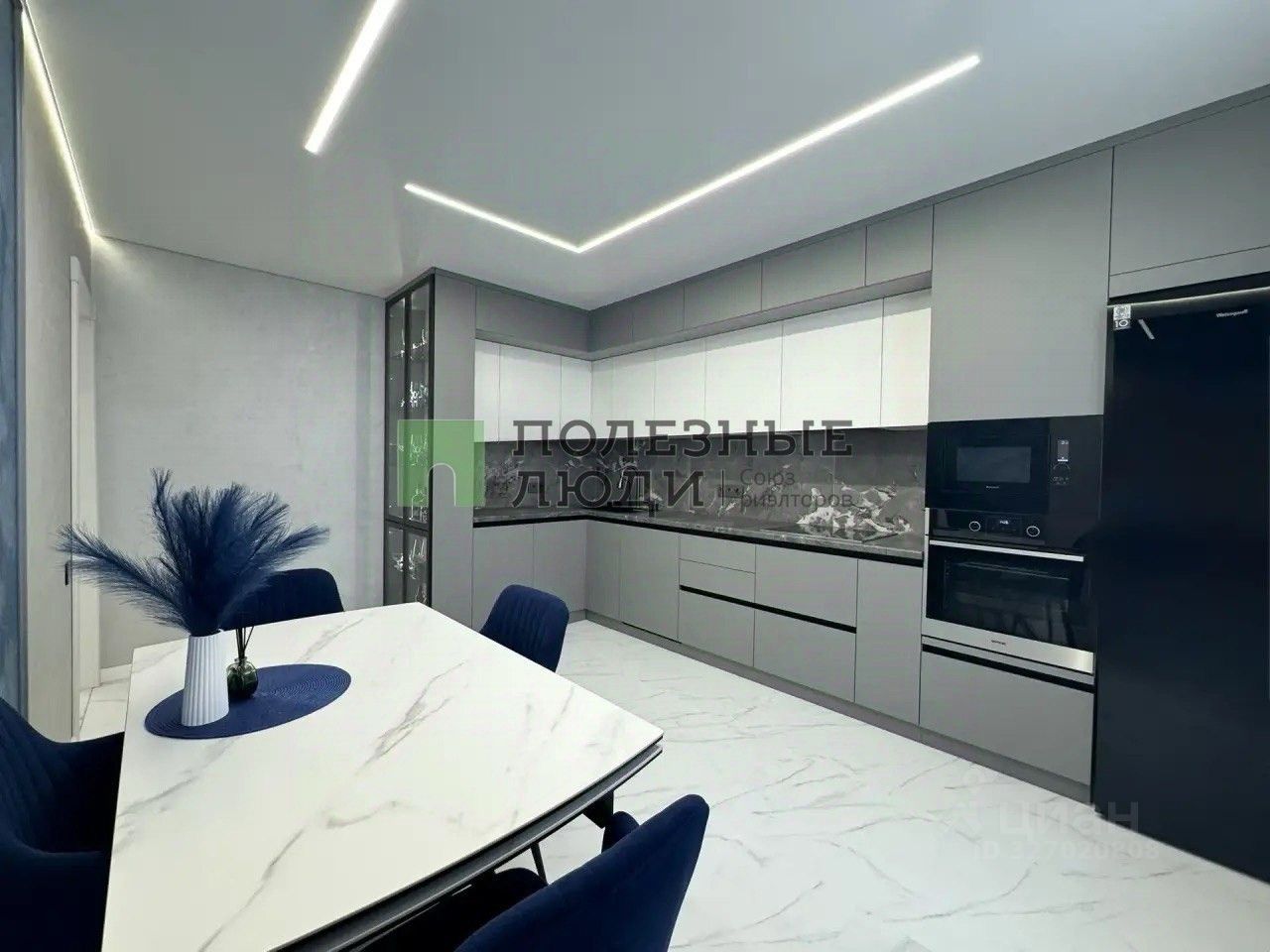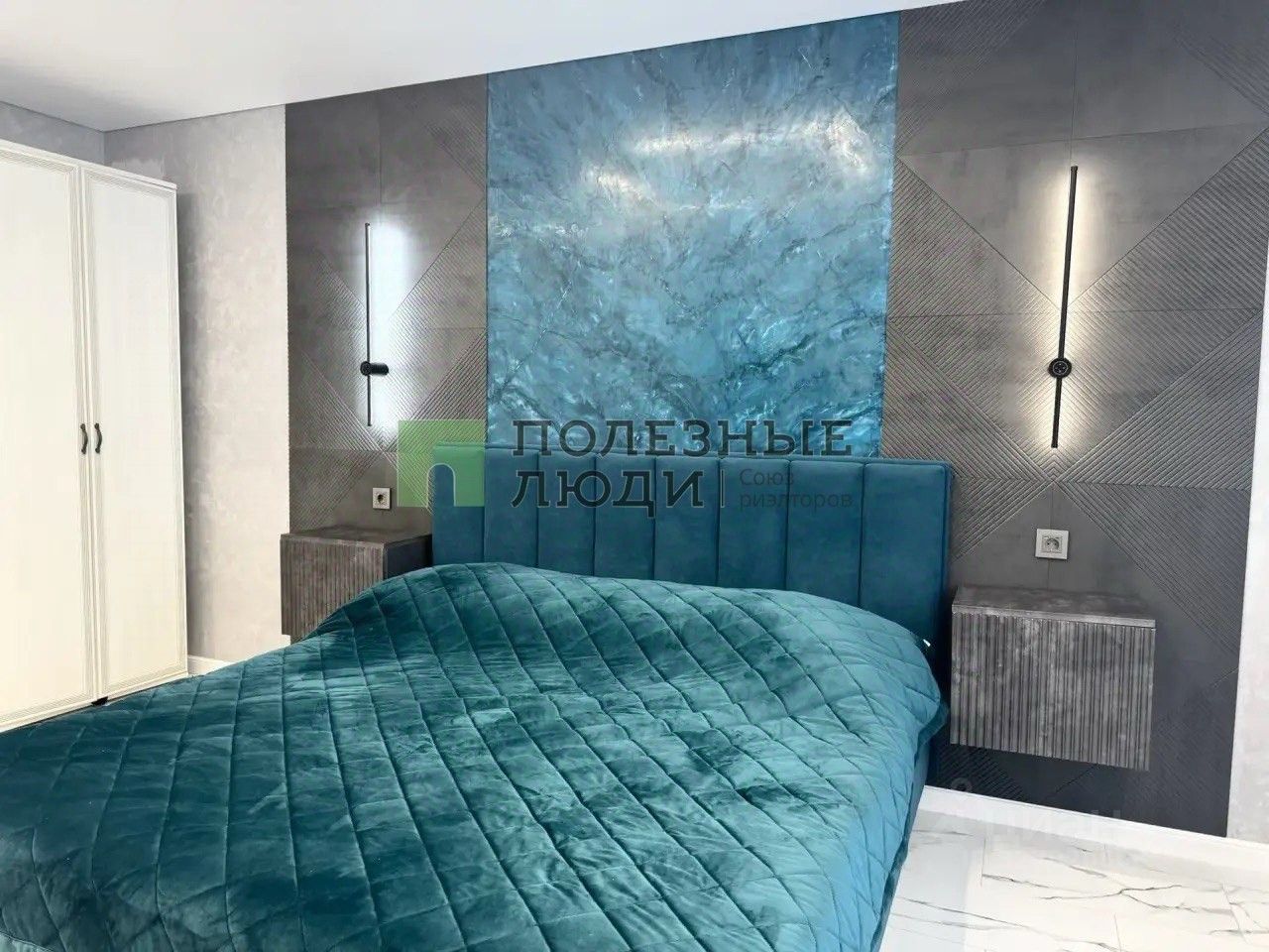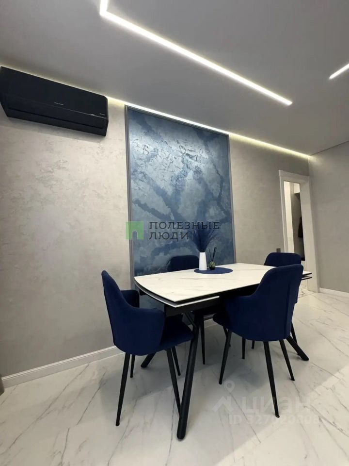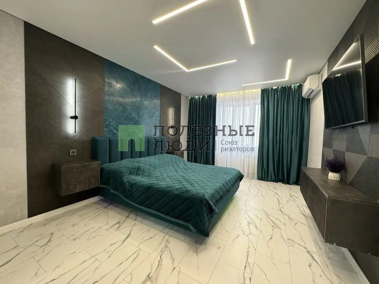 Материалы и комфорт: Полы - кварцвинил (теплый, износостойкий, водонепроницаемый). Окна - новые, затемненные, двойной стеклопакет (тишина и прохлада). Светодиодные ленты выведены так, что можно менять настроение комнаты одним движением. Подсветка штор - на отдельной клавише. Кондиционеры инверторные. На кухне - с управлением через Wi-Fi. Двери эмалированные с итальянской фурнитурой Abriss. Розетки - стекло, выключатели - сенсорные. Венецианская штукатурка: текстуры ''Бархат'' и ''Мокрый шелк'' меняют оттенок в зависимости от света. А картины на стенах - тоже часть этой уникальной штукатурки. В спальне парящая кровать с подсветкой.