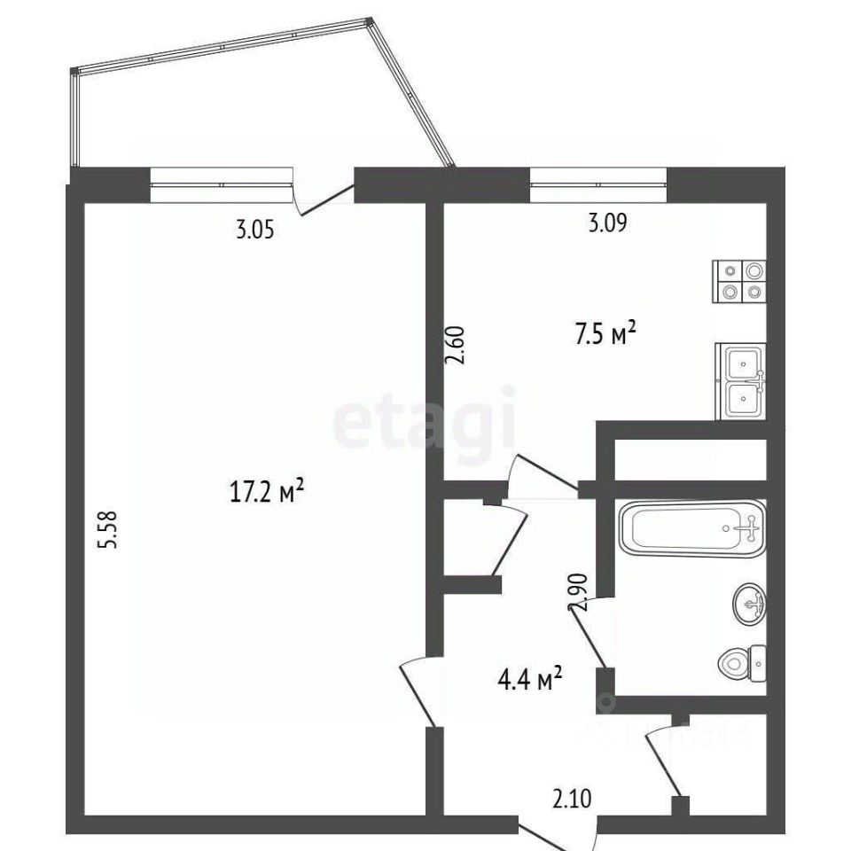 Общая площадь 33,2 кв м, кухня 7,5 и комната 17,42 кв м